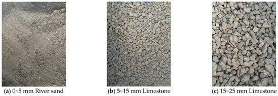 The strength of cement concrete pavement comes from the cementing strength of the concrete mixture. Three different sizes of limestone aggregates used in the experiment were from Suzhou Sanchuang Pavement Engineering Co., Ltd., Changshu, China, as shown in Figure 1. The performance test results of the aggregates are shown in Table 2. The aggregates used in the experiment meet the relevant requirements of Chinese standard JTG 3432-2024 [].