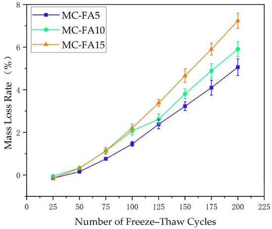 From the mass loss rate curves for 200 freeze–thaw cycles with different fly ash contents shown in Figure 5, it is evident that the higher the fly ash content, the faster the increase in the mass loss rate of manufactured sand concrete. After 200 freeze–thaw cycles, the mass loss rates for manufactured sand concrete with 5%, 10%, and 15% fly ash content were 5.06%, 5.91%, and 7.24%, respectively. After 150 freeze–thaw cycles, the mass loss rates for manufactured sand concrete with 5%, 10%, and 15% fly ash content increased by 323%, 237%, and 308%, respectively, compared to the rates after 75 cycles. This indicates that the more freeze–thaw cycles the concrete undergoes, the more severe the freeze–thaw erosion. During the first 50 freeze–thaw cycles, the mass loss of manufactured sand concrete showed almost no difference, indicating that fly ash has little effect on early freeze–thaw resistance. However, after 200 freeze–thaw cycles, there is a significant difference in the mass loss rate, suggesting that fly ash has a substantial impact on the later freeze–thaw erosion of manufactured sand concrete. Yuan et al. [] set the fly ash content between 0% and 10% and found that the frost resistance of concrete was optimal when the content of fly ash was 6%. However, when the content exceeded 6%, the frost resistance continuously decreased, which is consistent with the results of the aforementioned experiment.