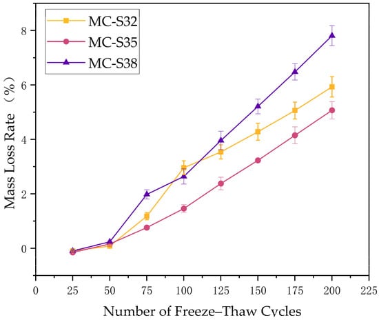 Figure 5 and Figure 6 show the mass loss rate curves of manufactured sand concrete. During the first 50 freeze–thaw cycles, the mass loss rate curves of the specimens with various mix proportions changed slightly, and the mass loss rate values were negative. This is partly due to the hydration reaction of the concrete being promoted by water immersion, and partly due to the mass increase caused by water in the internal pores of the concrete freezing in the early stages. However, after 50 freeze–thaw cycles, the freeze–thaw erosion of the specimens intensifies, leading to a rapid increase in the mass loss rate.