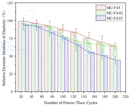 From Figure 7, it is quite evident that there is a negative correlation between fly ash content and the relative dynamic modulus of elasticity. The relative dynamic modulus of elasticity curves for manufactured sand concrete with 10% fly ash content were similar to those with 5% fly ash content and higher than those of other comparison groups. The relative dynamic modulus of elasticity for manufactured sand concrete with 5% fly ash content decreases more gradually during the first 75 freeze–thaw cycles, while those with 10%, especially 15% fly ash content, exhibited an almost linear decrease. At 75 freeze–thaw cycles, the relative dynamic modulus of elasticity for manufactured sand concrete with 5%, 10%, and 15% fly ash content was 92.4%, 90.6%, and 83.9%, respectively. By the time 150 freeze–thaw cycles were reached, these values had decreased to 75.1%, 68.3%, and 55.4%, representing decreases of 18.7%, 24.2%, and 33.9%, respectively. This indicated that as the fly ash content increased, the rate of decrease in the relative dynamic modulus of elasticity of manufactured sand concrete accelerated. The conclusions of studies by Yuan [] and Wang et al. [] are also similar to the findings mentioned above.