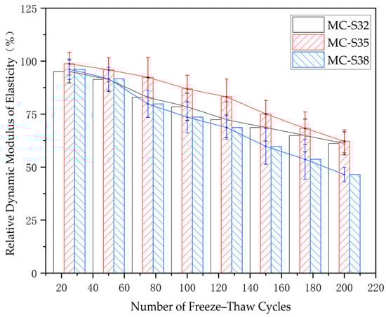 From Figure 8, it can be seen that the changes in the relative dynamic modulus of elasticity for manufactured sand concrete, according to the sand ratios from largest to smallest, are 35%, 32%, and 38%. This pattern was consistent with the trend of the mass loss rate. This indicates that in this study, a sand ratio of 35% was the optimal ratio, providing the best dynamic performance for manufactured sand concrete.