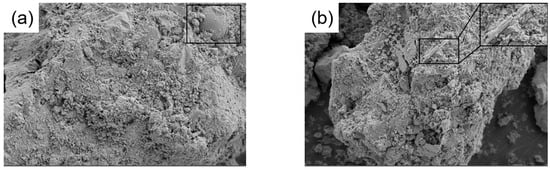 In Figure 9a, the upper right corner shows fly ash particles, and the microstructure in the image effectively demonstrates the filling effect of fly ash particles. These particles not only fill the voids, improving the density of the concrete, but also react with calcium hydroxide to form C-S-H gel, as shown in Figure 9b. However, previous experiments indicated that as the fly ash content increases, the frost resistance of the concrete decreases. This is because fly ash was added by replacing a portion of the cement, and excessive fly ash can reduce the extent of the cement’s hydration reaction, leading to insufficient C-S-H gel formation, which fails to adequately improve the concrete’s strength and porosity.
