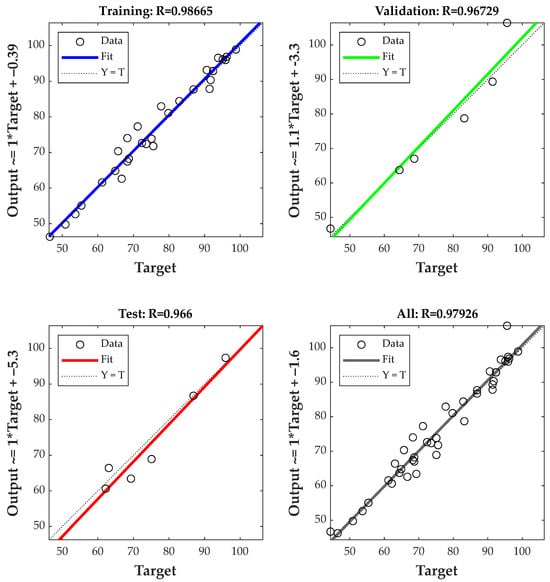 The correlation coefficient of the samples was a crucial metric for assessing the prediction accuracy of the BP neural network. Figure 13 and Figure 14 present the correlation coefficients obtained after model training.