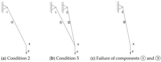 Eight possible failure conditions of the structure are shown in Table 1. In condition 2 (in Figure 2a), . Components ② and ③ are damaged, and the structure forms a mechanism failure, called the first failure stage. In condition 5 (in Figure 2b), . Component ③ is damaged, and no mechanism forms in the structure. Therefore, after component ③ fails, it enters the second failure stage, and the internal force of the components is redistributed. When components ① and ③ are damaged (in Figure 2c), the structure forms a mechanism and then fails.