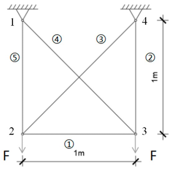 The dimensions of the plane truss are shown in Figure 4, and the material parameters are shown in Table 2. The range 1~4 indicates the node numbers, and ①~④ are component numbers. With a vertical force F = 25 kN applied to nodes 2 and 3, the resistance of each component is 550 kN and its standard deviation is 16.5 kN.