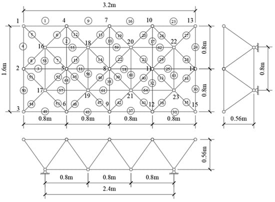 The geometric dimensions of the square pyramid truss structure are shown in Figure 6. With a total of 64 components, the cross-section is 0.847 × 10−3 m2, and each component is 0.8 m long. The average load, the load standard deviation, and the sectional tensile strengths are 60 kN, 10 kN, and 313 kN, respectively. Force p is applied to nodes 1, 3, 13, and 15; 2P to nodes 2, 4, 7, 10, 14, 6, 9, and 12; and 4P to nodes 5, 8, and 11. The reliability values of some components are shown in Table 3.