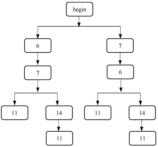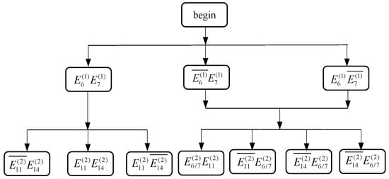 Components ⑥ and ⑦, which have the lowest reliability, as shown in Table 3, are selected. Then, two components, ⑥ and ⑦, form a set of collectively exhaustive events to constitute the first failure stage. The failure path is shown in Figure 7. If the β bound method is used, only one component, ⑥ or ⑦, can be selected. The failure path is shown in Figure 8. Although the components selected in the whole path are the same, the calculation steps in the bound method and collectively exhaustive events are simplified, and efficiency is high.
