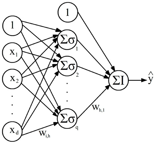 ANNs are built upon the concept of biological neural networks. Artificial neural networks (ANNs) are highly efficient methods for forecasting, grouping, identifying, and organizing data [44,45]. Their learning capabilities from training data are excellent and serve as “black boxes.” As shown in Figure 1, a basic neural network is composed of an input layer that takes in input variables and an output layer that produces output signals. Hidden layers are sometimes defined as the layers that sit between the input and output layers. Selecting the right hidden layer is essential because too many hidden layers cause the model to overfit, while too few hidden layers cause the model to underfit [46]. In addition, the presence of additional hidden layers in the model leads to an increase in the estimation time [47]. The intermediate computations that determine the neural network’s output value are carried out by the hidden neurons that make up the hidden layers. Table 1 describes the statistical features of the data. The synaptic weight (wi) is multiplied by each input (xi). During the learning process, the weights are adjusted to obtain a certain level of accuracy. Applying bias, hidden layer neurons compute the weighted sum of the incoming signals (b). Bias is eliminated when there is insufficient meaningful input data, enabling the neuron to modify output independent of input values. Y is output following the transmission of the total through the activation function (f):