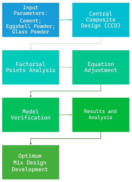 A thorough mathematical and statistical technique for modeling and assessing experimental problems is the response surface method (RSM) [35]. Multiple simultaneously varying factors are fitted to a quadratic function in RSM [36]. Compared to the laborious one-element-at-a-time strategy, which also ignores the interactions between factors, RSM provides a number of advantages for optimization [37]. RSM uses a mathematical model to forecast the desired qualities by proportioning the constituent materials to create an ideal blend [38]. This method is frequently used for experiment design and optimization, but its application in the concrete industry is very limited [39]. Moreover, RSM has been used in different studies on cement and concrete [40,41,42], but it has not been used much with concrete that has WGP and ESP. Therefore, the primary focus of this study is on applying RSM to forecast and optimize the compressive strength of ESP and WGP concrete. Lately, there has been an increase in interest among researchers in investigating the suitability of ANN machine learning modeling techniques and RSM (non-machine learning technique) for identifying practical solutions to problems. In order to compare the impacts of eggshell powder and recycled waste glass on concrete compressive strength, this study uses RSM and ANN to substitute cement and fine aggregate partially. In this study, ANN and RSM models were constructed using experimental data. The statistical measurements of mean square error (MSE), coefficient of determination (R2), and correlation coefficient (R) were used to assess and compare the accuracy of the created models. To the best of the authors’ knowledge, this is the first study to compare RSM with ANN for the purpose of forecasting mechanical qualities, including waste materials like eggshell powder and recycled waste glass.