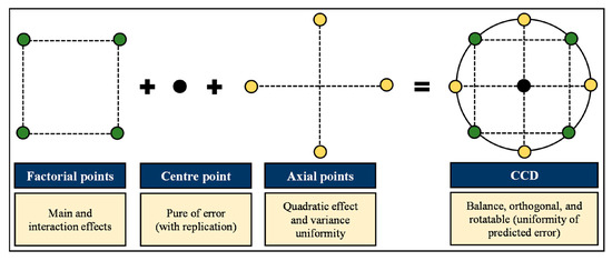 Illustration of factorial, center, and axial points in a central composite design (CCD) [54].