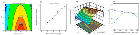 The model’s F-value of 105.03 indicates that the model is statistically significant. The probability of an F-value of this magnitude occurring solely due to noise is only 0.01%. The p-value was 0.0001 less than 0.0500 indicates the model’s terms are significant [55]. It is noteworthy that A, B, and A2 hold considerable importance as model terms. Values beyond 0.1000 suggest that the model’s terms lack significance. As shown in Figure 4a, the highest compressive strength predicted was 49.08 MPa at a cement content of 761 kg/m3 and w/c 0.25, while the lowest compressive strength predicted was 33.72 MPa at a cement content of 689 kg/m3 and w/c 0.29. The distribution of predicted and actual values (predictions vs. actual values) for compressive strength is displayed in Figure 4b, where the data once more follows a straight line. The predicted R2 of 0.8729 is in reasonable agreement with the adjusted R2 of 0.9775; i.e., the difference is less than 0.2. Adeq precision measures the signal-to-noise ratio. A ratio greater than four is desirable. Hence, a ratio of 28.688 indicates an adequate signal. This model can be used to navigate the design space. As shown in Figure 4c, the process order was quadratic. The perturbation plot for response 1 presented in Figure 4d revealed that all two factors have a significant influence on compressive strength. Figure 5 displays the compressive strength of response 2 in several formats, including a 3D view, contour graph, predicted vs. actual results, and perturbation.