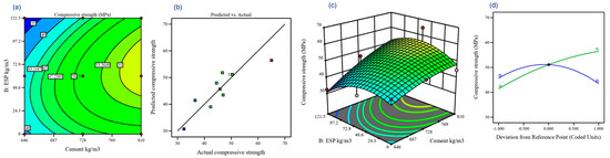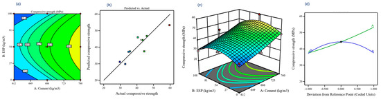 The equation, in terms of coded factors, can be used to make predictions about the response for given levels of each factor. By default, the high levels of the factors are coded as +1 and the low levels are coded as −1. The coded equation is useful for identifying the relative impact of the factors by comparing the factor coefficients [36]. The compressive strength significantly increased at a cement content of 723 kg/m3, with increases of 12%, 16.31%, 12.71%, and 0.72% seen for 27, 54, 81, and 108 kg/m3 of ESP, respectively, compared to 0 ESP, as shown in Figure 6a. The model is deemed significant based on its F-value of 5.16. The probability that an F-value this great may be the result of noise is merely 2.66%. The model’s terms are significant when the p-values are less than 0.0500, which is 0.0266 in this case. The predicted R2 of 0.6533 is in reasonable agreement with the adjusted R2 of 0.7035; i.e., the difference is less than 0.1, as shown in Figure 6b. As shown in Figure 6 and Figure 7c, the process order was quadratic. As shown in Figure 6c, the highest predicted compressive strength was 59.6 MPa, and the lowest predicted compressive strength was 29.7 MPa. Figure 6 and Figure 7d are perturbation plots, which illustrates the effect of all the design parameters at a center point in the design space.