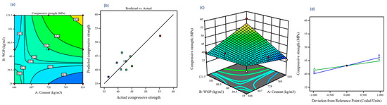 The model’s F-value of 3.74 implies there is a 5.73% chance that an F-value this large could occur due to noise. The model’s terms are considered significant when the p-values are less than 0.0500, and in this case, the p-value is 0.0473. The contour lines that followed the axes of WGP and cement were denser, as seen in Figure 7a, suggesting that the WGP and cement content have a bigger impact on compressive strength. The p-values are less than 0.05 when the mechanical properties are assessed using ANOVA, as demonstrated in Table 3, suggesting that the model is very significant [35,39].