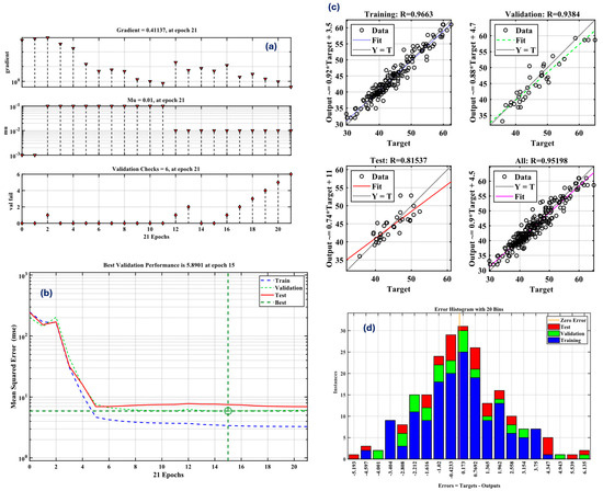 Figure 8a displays the ANN model’s training state and shows that errors are repeated six times after epoch 0 and that the test ended at epoch 21. The weights from the first epoch, 0, are taken as the final weights and considered the reference point. Hence, the validation check is six since the faults occur six times before the procedure is terminated. Epoch 15 outperformed the others in the validation of the artificial neural network model, as shown by Figure 8b, with a mean squared error of 5.8901. The ability of the model to predict compressive strength with an R2 value of 0.907 is demonstrated by the non-linear correlation between the input variables in Figure 8c. To further illustrate the difference between the real and anticipated values, Figure 8d shows the distribution of error bins. The high proportion of the dataset falling into smaller error bins suggests that the model’s predictions for concrete’s compressive strength are likely quite accurate.