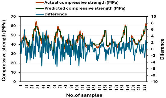 The RSM and ANN approaches were used in this study to forecast compressive strength. ANN-based degrees of experimentation and RSM have emerged as the most widely used model and process optimization techniques in recent years [57]. We looked at the correlation between the projected and observed numbers to determine how accurate the mathematical models were. The significant correlation confirmed that the mathematical models accurately predicted the outcomes. Table S1 displays the statistical evaluation and performance of the response surface methodology (RSM) and artificial neural network (ANN) models that were constructed. The results showed that, for both methods, the projected values of the compressive strength model agreed well with corresponding experimental values. Nevertheless, it has been observed that the RSM models for pre-designed mixes have limitations in their ability to accurately anticipate reactions when compared to artificial neural networks (ANN). The link between the expected and actual results of the RSM and ANN models was assessed using the determination coefficient (R2) in order to verify the suitability of the finished models. Using the statistical characteristics shown in Table 3 and Table S1, the created response surface method (RSM) and artificial neural network (ANN) models were assessed for correctness. Compared to the RSM techniques, the precision of the ANN-estimated R2 was higher, and the results were significantly closer to one. As a result, the ANN-generated models demonstrated increased predictive power and accuracy. As indicated via lower MSE values which the ANN obtained in contrast to the RSM, the ANN performs better than the RSM.