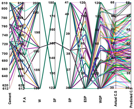 The absolute error distribution between the expected and experimental results is shown in Figure 9. Figure 10 shows the inputs of ANN and outputs of ANN as a Parallel Coordinates plot. An outline of the biggest inaccuracy in the ANN model may be found in this figure. The analysis of the absolute errors for CS showed that the maximum error observed was 5.97 MPa, while the lowest error seen was 5.24 MPa. According to this result, there may not be much of a difference between the targets and the predictions made using the ANN equations. Understanding that events with higher mistake frequencies are less prevalent is important.