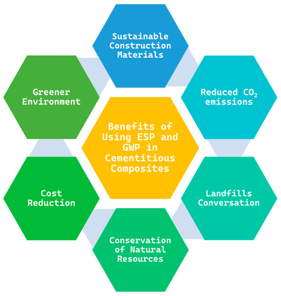 The current study investigated the efficacy of the ML and non-ML prediction models for assessing the compressive strength of cement concrete when ESP and WGP were used in place of some the sand and cement. There is a significant amount of waste eggshell production worldwide, most of which is dumped in landfills, endangering both human health and the environment [58]. Furthermore, the most widely used building material is cementitious composite [59,60,61], but its widespread use depletes natural resources and produces CO2 [62,63]. An environmentally responsible way to replace some of the sand and cement in building materials is to use eggshell waste. Therefore, by lowering waste, preserving natural raw materials, and lowering CO2 emissions, the use of eggshell waste in building materials will lessen its negative effects on the environment. In the same manner, the research revealed that glass has a phase and chemical composition consistent with conventional SCMs [64]. It might be of little economic worth, is plentiful, and frequently buried in land [65]. The attributes of fineness, chemical composition, and the presence of pore solution for reaction all affect the pozzolanic behavior of waste glass and the majority of pozzolans in concrete [66]. The benefits of using ESP and GWP in concrete are summarized in Figure 11.