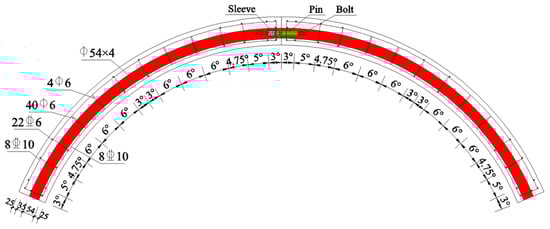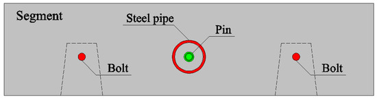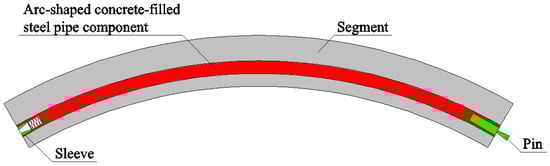 It is still a challenging task to overcome the problems involved in traditional segment structures, such as large deformations, concrete cracking, and seepage. It is well-known that concrete-filled steel tube (or pipe) (CFT) structures can ideally combine the advantages of steel and concrete materials in terms of high strength and high stiffness [20,21,22]. In this work, an arc-shaped concrete-filled steel pipe component (hereinafter referred to as the ASCFSP component) was combined with an ordinary segment to design a new type of composite segment for the construction of shield tunnels to enhance the mechanical performance of the segment under complex geological conditions. The structure of the new composite segment is shown in Figure 1. To match the new composite segment, a kind of plug-in joint (composed of a sleeve and a pin) was added at the joint of the new composite segment and worked together with the bolts to form a type of combined splicing joint, which is believed to reduce the deformation of the segmental joints. A cross-sectional view of the combined splicing joint is shown in Figure 2. The plug-in joints were installed in the ASCFSP components to connect the ASCFSP components to form a concrete-filled steel pipe-bearing ring structure.