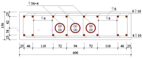 The main difference between the 4 segments was the number of ASCFSP components contained in the inner segment. The ordinary segment did not contain ASCFSP components and was named PT0; the 3 new composite segments contained 1, 2, and 3 ASCFSP components and were named FH1, FH2, and FH3, respectively. The installed positions of the segment cross-sections of the steel bars and ASCFSP components are shown in Figure 3, where the numbers (1), (2), and (3) indicate the ASCFSP component installation positions of the specimens FH1, FH2, and FH3, respectively. The installed positions of the segment circumferential steel bars and steel pipes are shown in Figure 4.