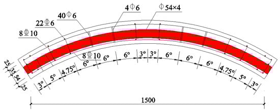 Four scaled-down segments were made for the tests, including one ordinary segment and three new composite segments, where the scale ratio of the four scaled-down segments was 1:2. The dimensions of the 4 segments were the same, and the size parameters were as follows: the outer and inner radii were 1500 mm and 1350 mm, respectively. The width was 600 mm and the center angle was 67.5°. The outer and inner radii were 1440 mm and 1386 mm, respectively. The steel grade was Q235B. Its elastic modulus was 210 GPa, and the yield and ultimate strengths were 200 and 224 MPa, respectively. The concrete used for the 4 segments and ASCFSP components was C50, and the 28-day cube compressive strength of the concrete adopted in the test was 51.3 MPa.