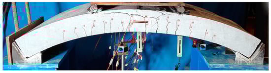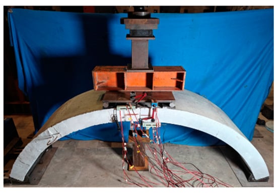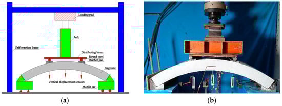 The test was performed with a large self-reaction test frame with a measuring range that reached 1000 kN, and the loading mode was 4-point loading, that is, 2 points for the support and 2 points for the loading point. The load of the segment was divided into 2 points by the distribution beam installed at the lower part of the jack, and 2 round steels were welded on the distribution beam. The lengths of the 2 round steels were consistent with the width of the segment and could cover the full width of the segment. Two rubber pads with thicknesses of 20 mm were installed at the contact between the 2 round steels and segments to prevent local crushing of the concrete. Vertical displacement sensors were arranged in the middle span and loading points of the segment’s inner arc to measure the vertical deformation of the segment. The segment test device is shown in Figure 5. The left support was fixed in the vertical and horizontal directions and the right support was fixed in the vertical direction. A preloading procedure was conducted by applying a vertical load up to 10 kN and then unloading to 0 kN, which was undertaken to ensure that the segment was in complete contact with the support. Next, formal loading was carried out. Loading was applied at increments of 20% of the design load. The loading time for each level was 5 min. After the design load was reached, the load was further increased in increments of 5% of the design load until segment failure.