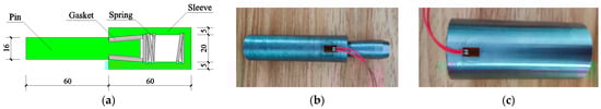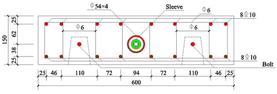 The suggested combined splicing joint consists of two types of joints: one for the traditional bolt joint and the other for the plug-in joint (Figure 8). The pin and sleeve parts are each embedded in their own segment. During the construction process, two segments can be conveniently connected by the plug-in joint so that the load capacity of the segmental joint is expected to be enhanced. A total of four test specimens were prepared in this study. The dimensions of the four specimens were the same as those listed in Section 2.1. Two hand holes and two bolt holes were reserved on each segment for installing bolts. In addition to reserving the hand holes and bolt holes in each segment, different plug-in joints were included. The two pieces of the ordinary segments were spliced together with two bolts to form an ordinary segment joint, which was named JT0. For JT1, JT2, and JT3, one, two, and three plug-in joints were embedded, respectively. The bolts were 240 mm-long straight bolts. The plug-in joint was made of no. 45 steel. The cross-section and circumferential section structures of the combined splicing joint sleeve end are shown in Figure 9 and Figure 10.
