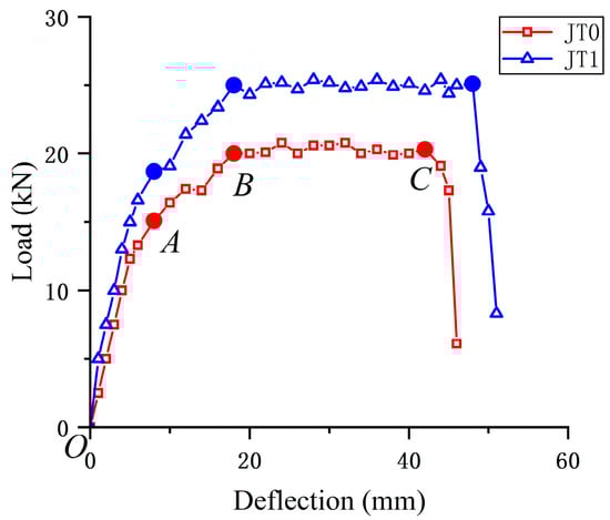 Figure 7 shows the load–deflection curves at the mid-span of the four specimens. The results indicate that the variation laws of the mid-span load–deflection curves of the four specimens were basically the same and could be divided into three parts. Before the specimens cracked, the load–deflection curves changed linearly; this corresponds to the OA sections in Figure 7. After the specimens cracked, the slopes of the load–deflection curves decreased by a certain extent but still behaved in a linear manner; this corresponds to the AB sections in Figure 7. When the vertical load reached the yield load of the specimens, the load–deflection curves of the specimens changed from a linear change to a nonlinear change, the plasticity of the specimens increased continuously after the specimens reached their yield strength, and the deformation of the specimens increased continuously until failure; this corresponds to the BC sections in Figure 7. The loads at points B and C were named the yield and ultimate loads, respectively.