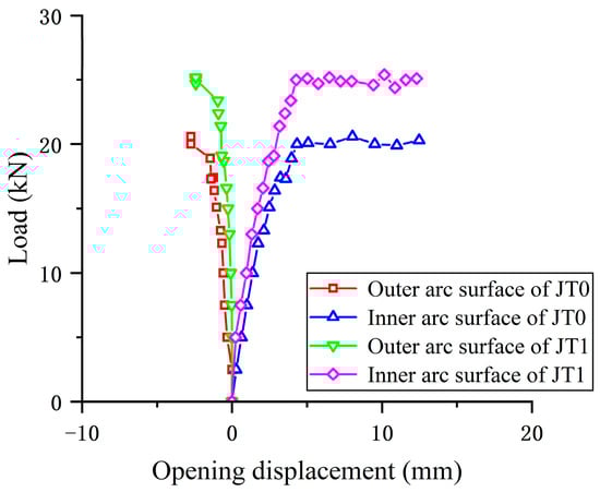 Figure 14 shows the load–displacement curves, which indicate that the opening of the specimen joint was positive and that the closing was negative. Notably, the installation of the displacement sensors and the measurement of the displacement data began after the specimen was installed on the self-reaction frame; therefore, the measured opening displacement data did not include the initial opening displacement of the specimen. As shown in Figure 14, the opening displacement of the inner arc surface specimen was larger than that of the outer arc surface. After the load reached the peak, the opening displacement basically no longer changed, whereas the opening displacement of the inner arc surface of the specimen continued to increase because of the bolt deformation and support slip. Under the same load, the opening displacements of the inner and outer arc surfaces of specimen JT1 were smaller than those of specimen JT0. This indicates that adding a plug-in joint at the segment joint reduced the opening displacements of the inner and outer arc surfaces.