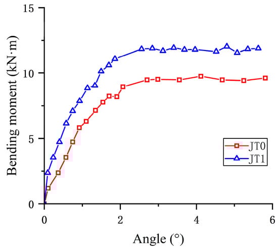The bending moment at the joint was obtained via vertical load conversion. After the calculation was complete, the calculation results were drawn as bending moment–angle curves, as shown in Figure 15; under the same bending moment, the angle of specimen JT1 was smaller than that of specimen JT0, which indicates that adding a plug-in joint at the segment joint improved its rotational stiffness.