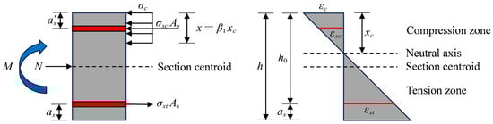 After the height of the concrete compression zone is calculated based on Equation (7), the bar stresses in the tension and compression zones are further calculated to verify whether they meet the above assumption. If the condition is satisfied, then the formula for the ultimate bending moment is obtained by taking the moment of the resultant point of the concrete in the compressive zone in Figure 16 as follows: