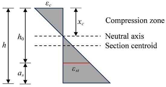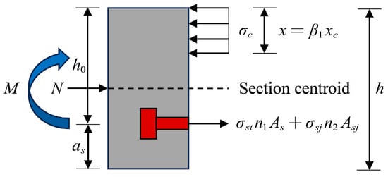 After the height is determined by Equation (11), the stresses of the concrete and bar in the compressive zone are further calculated to verify whether they meet the above assumption. If the condition is satisfied, then the formula for the ultimate bending moment is obtained according to Figure 16 as follows: