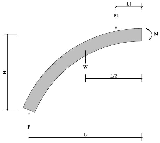where is the outer diameter of the steel pipe and is the equivalent calculated length of the arch. For the arch structure with a vector span ratio , the equivalent calculated length in the arch plane is calculated using Equation (21):