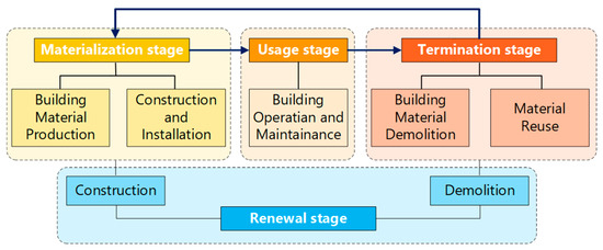 The concept of life cycle assessment (LCA) was first proposed in the United States in the 1990s. In 2006, the International Organization for Standardization (ISO) defined LCA as the compilation and evaluation of the inputs, outputs, and potential environmental impacts of a product system throughout its life cycle. Based on the LCA theory, the full life cycle of a building is divided into four stages: the production and transportation of building materials, construction and building, building operation, and demolition and disposal. Today, LCA has become a critical tool for assessing sustainable development and environmental protection across various fields, including the building and construction industries [9].