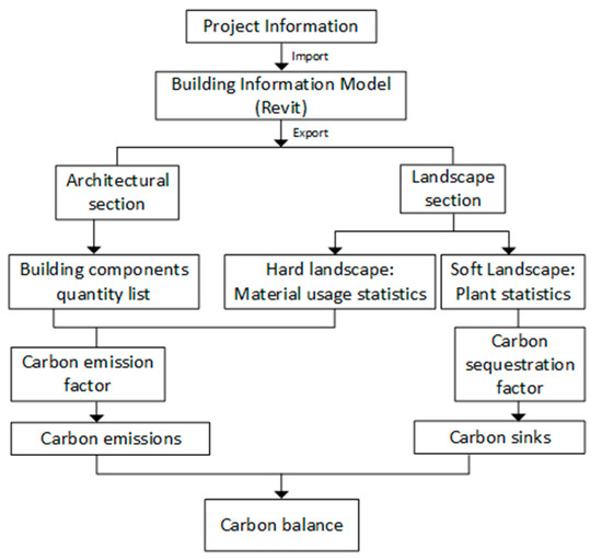 Regarding the calculation of carbon emissions in the materialization stage, there are three main types of mainstream calculation methods in the international arena, namely the input–output, material balance, and carbon emission coefficient methods. Luo Zhixing et al. proposed a methodology that divides the building design process into three phases: conceptual, schematic, and construction document designs. They introduced carbon emission estimation methods based on “large-scale case study statistical regression”, “building components”, and “a list of ten types of major building materials” [14]. Zhenwei Lu et al. designed and implemented a building carbon emission calculation cloud platform based on a full life cycle assessment (LCA) and energy consumption collection system, which is capable of comprehensively collecting a building’s energy consumption data, calculating its carbon emissions, and providing technical support for low-carbon designs [23].