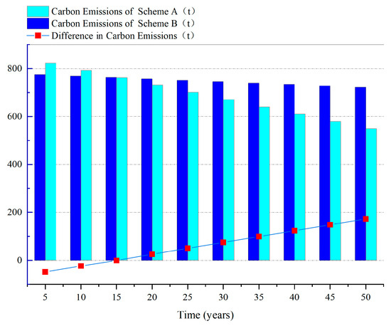 Statistics on the carbon balance of the two schemes reveal that, although the total carbon emissions for Scheme A are higher than those for Scheme B during the renewal and reconstruction stages, the annual carbon sink for the former is significantly greater. Carbon sequestration by plants accumulates over time, as illustrated in Figure 4. According to a life cycle calculation spanning 50 years, the difference in carbon balance between the two schemes would approach zero by the 16th year after completion. Figure 4 shows the difference in carbon emissions between the two schemes. It demonstrates that, from year 0 to year 16, Scheme A exhibits a negative carbon balance compared to Scheme B, indicating higher carbon emissions for the former. However, beyond year 16, Scheme A shows a positive difference, suggesting lower carbon emissions relative to Scheme B. Over time, as plant carbon sinks accumulate, the benefits of Scheme A become increasingly apparent.
