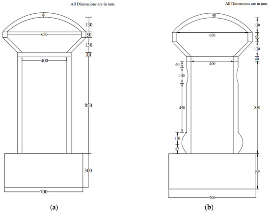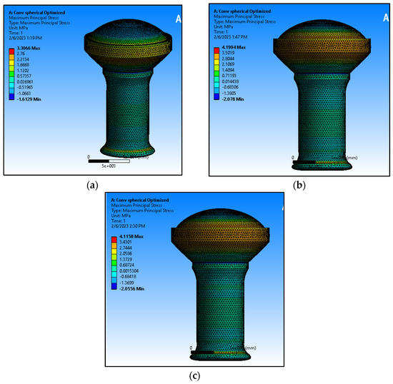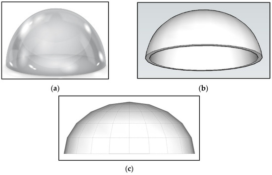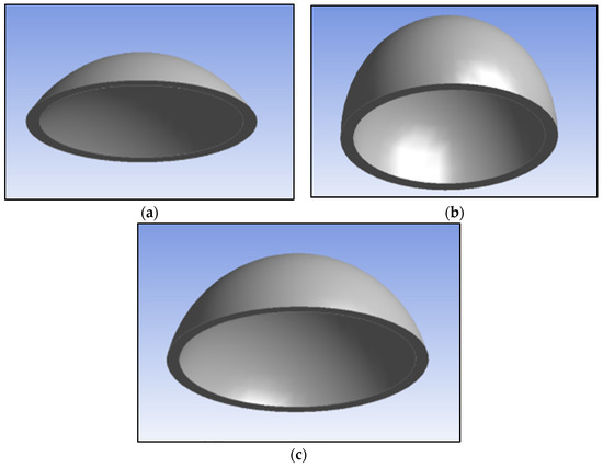 From the conventional shapes of the shells, three different shapes, including spherical, circular, and elliptical shells, shown in Figure 4a–c, respectively, were selected for comparative analysis. Since the ratio (rise to span) of less than falls under the hollow shell for spherical shells, the ratio from to was adopted as per IS 2210: 1988 [33]. For circular shells, the rise-to-span ratio adopted was , as it is obligatory. The ellipticity ratio (ratio of semi-minor axis to major axis) was used to define the parameters of the elliptical shell. In this study, the ellipticity ratio was found to be 1.36 based on the geometric characteristics of the cranium, which classify it as an oblate ellipsoid.