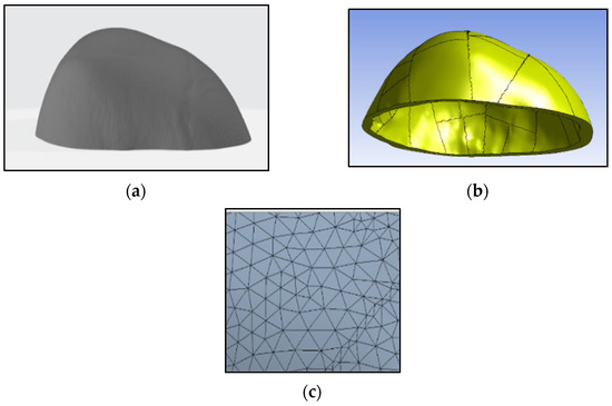 The 3D model was generated and analyzed from the cranium scan images. Over the created models, triangular meshes of size 3 mm were created since the trapezoidal meshes are not feasible for the cranium. The developed 3D model and the imported model are shown in Figure 6a,b, respectively. Also, a triangular mesh of size 3 mm was created for the imported cranium model, as shown in Figure 6c.