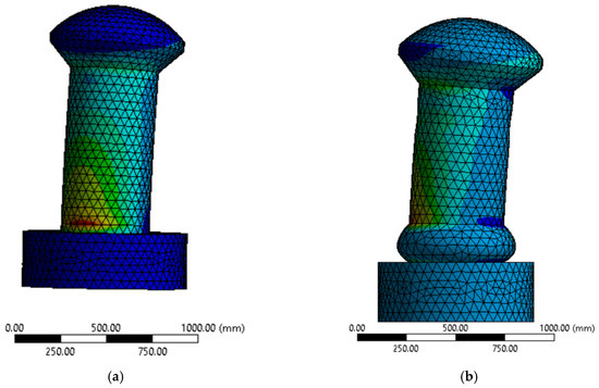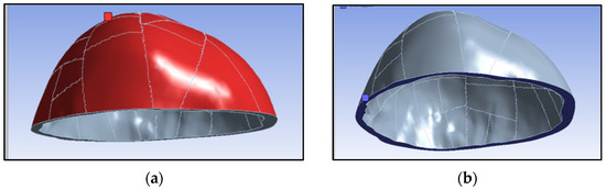 Here also, a pressure of 1 kN/m2 was applied to the external face of the cranium with the base fixed as a boundary condition, as shown in Figure 8a,b, respectively. The same loading and boundary conditions were followed for the analysis of the shells of both criteria.