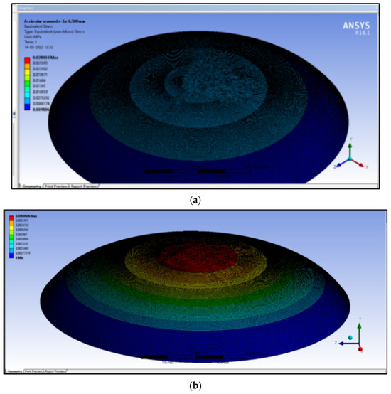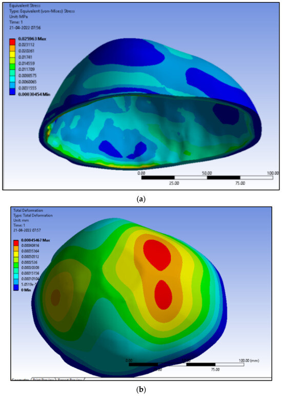 From the analysis of the cranium, the equivalent stress and the displacement were obtained as 25.96 kN/m2 and 4.56 × 10−7 m, respectively. The maximum stress for the cranium was observed at the edges and the minimum stress at the crown. The maximum displacement was observed at the external face of the crown (i.e., at the frontal region of the cranium). The stress pattern and displacement pattern are shown in Figure 9a,b, respectively.