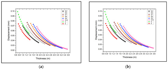 Displacement vs. thickness: (a) for 10.803 and (b) for 11.101.