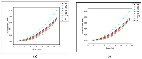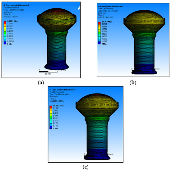 For criterion 1 adopted (constant span, varying thickness), based on the stress results of the cranium and shell models, the shape was optimized. The equivalent stress pattern and displacement pattern for the S5 model are shown in Figure 10a,b, respectively. Similar stress and displacement patterns were observed for S6–S10, C, and E shells. From the displacement obtained from the models analyzed, the graphs were plotted for each criterion to conclude the behavior of the shells under different parameters. The shape of the shell was optimized by considering stress equivalent to that of the HC. The stress pattern and displacement pattern for all the analyzed models are found to be similar to that of the HC, as shown in Figure 9. A similar procedure was followed for criterion 2 (constant thickness, varying span) and for each shape of the shell.