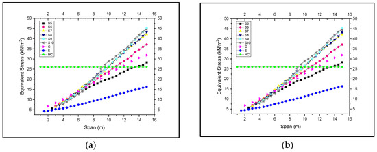 Similar stress and displacement patterns were observed for both criteria 1 and 2. The displacements versus thickness for both ratios (10.803 and 11.101) for criterion 1 is shown in Figure 11a,b, and for criterion 2, it is shown in Figure 12a,b, respectively. From the graphs, it can be observed that changes in displacement due to an increase in the thickness and span of the shells are linear. All the types of shells adopted exhibited similar kinds of behavior. As the thickness increases, the displacement decreases, and as the span increases, the displacement increases, as it is traditional and applies here also. From the equivalent stress obtained from the models, the graphs were plotted for each criterion to find the optimized model similar to the HC. The graphs for both ratios (10.803 and 11.101) for criteria 1 and 2, along with the equivalent stress of the HC, are shown in Figure 13a,b and Figure 14a,b, respectively. From the graphs, the models with stress equivalent to that of the HC are optimized and tabulated in Table 5 for criterion 1 and Table 6 for criterion 2, respectively (Model numbers indicated as M7, M44, M63, … M458 against shape and criteria are out of 510 models analyzed). It can be seen from the graphs that none of the models in E shells behaved similarly to that of the HC. Therefore, the optimized models that can be considered are S5, S6, S7, S8, S9, S10, and C shells.