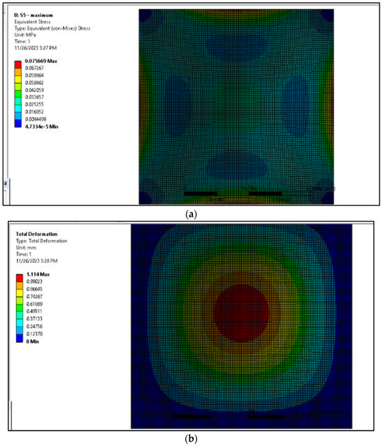 It was decided to study the shape effect of the HC with a conventional slab since the thickness (Table 3) is abnormal for the arrived () ratio from the HC. Therefore, the geometric parameters of the HC are converted into a slab to study the effect of the shape. A slab of dimension 0.175 × 0.145 × 0.0065 m reflecting the dimension of the HC was analyzed for the same loading and boundary conditions adopted as those of the HC. It was observed that the stress concentration (169.49 kN/m2) and displacement (2.3 × 10−5 m) of the slab were higher than those of the HC. The equivalent stress and displacement of the slab were observed to be more than 6.5 and 50 times those of the HC, respectively. However, the stress (Figure 15a) and displacement (Figure 15b) patterns were found to be similar to those of the HC.