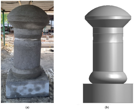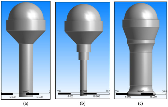 For the optimized shell size and shape to mimic the cranium, it is proposed to support a mono column. For this purpose, conventional circular and stepped-type shapes of columns were considered. Also, from the literature [39], the shape bio-mimicked from the femur bone was adopted to arrive at the most efficient supporting member for the water tank. Figure 5a,b represent the circular and stepped columns, respectively. Figure 5c shows the compression member bio-mimicked from the femur bone.