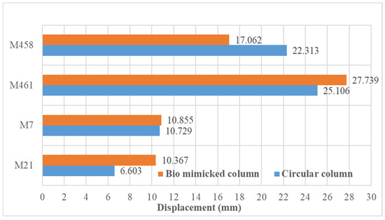The displacements were measured in conventional and bio-mimicked specimens opposite to the point of application of the load, as shown in Table 12. As per IS 3370 (Part I): 2009 [41], the factor of safety of 1.2 was considered for the calculation of the service load. The displacements of conventional and bio-mimicked specimens at service load were 36.45 mm and 32.89 mm, respectively. The displacements of conventional and bio-mimicked specimens at ultimate load were 45.61 mm and 40.14 mm, respectively. It can be observed that the displacement of bio-mimicked specimens at the ultimate load was 13% less than the conventional. The results from the experimental investigation were found to be higher due to several factors, such as material properties, environmental conditions, handling errors, and also the test setup. The base was fixed in the numerical investigation. A similar setup with a fixed base was prepared manually. Thus, each stage of testing influences the experimental results. It is possible to restrict the displacement of monolithic elements by revising the sectional dimensions of the specimen and changing the reinforcement detailing and the strength of the concrete.