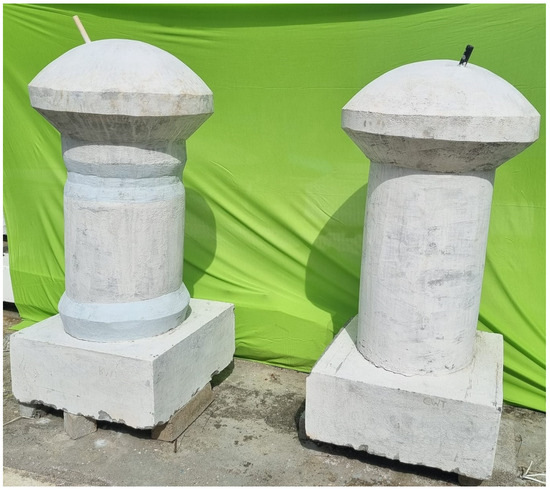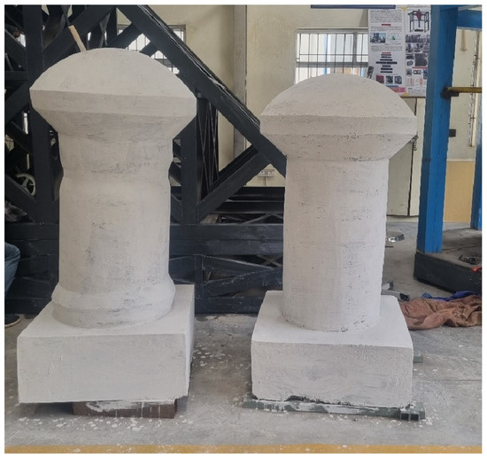 A crack occurred at the junction of the base slab and column for both the conventional and bio-mimicked specimens. For the conventional specimen, the crack occurred at a load of 77 kN, which was 70% of its ultimate load. Similarly, for the bio-mimicked specimen, the first crack was found at a load of 104 kN, which was 66% of its ultimate load. It seems that the bio-mimicked specimen also behaves in the same pattern of formation of cracks and almost at the same level of load capacity. The tested specimens are shown in Figure 35.