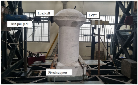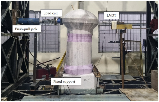 Specimens were whitewashed before testing, as shown in Figure 28. The specimen was placed in an upright position in the self-strained loading frame, having a capacity of 200 kN. The slab was fixed using clamps with bolts and nuts to restrain the movement during testing since the main aim was to study the lateral load behavior of the water tank. The total displacement of the shell was proposed to be measured exactly at the opposite of the load application point. A Linear Variable Differential Transformer (LVDT) was used to measure the deflection. Figure 29 and Figure 30 show the experimental setup arranged for testing conventional and bio-mimicked water tank specimens, respectively. The load point was selected at the face of the ring beam. Below the load point, a push–pull jack with a capacity of 50T and a load cell was used to observe the applied load. The load was applied monotonically. Also, the load was force-based; hence, the displacements were measured at each increment of the load. The load was applied over the element at a selected point, and water was filled to the top of the shell to consider the application of the water load with the provision of a hole in the top shell. Though the critical stress was observed with half-filled tanks in the numerical investigation, the tanks were filled completely during the testing of the specimen to avoid the sloshing effect and to withstand the water pressure in the shell. This water pressure mimics the intracranial pressure developed by the HC. The formation of cracks was monitored and noted during testing.