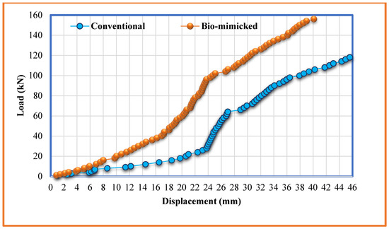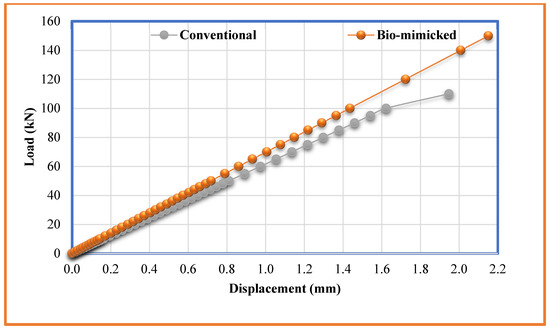 The conventional and bio-mimicked specimens exhibited a similar load–displacement pattern. Figure 33 shows the load-versus-displacement curve of experimental values of the conventional and bio-mimicked specimens. Figure 34 shows the load-versus-displacement curve of numerical values of the conventional and bio-mimicked specimens. It can be observed that the load–displacement behavior in the numerical investigation is linear because of the ideal properties of the materials defined in the analysis. Also, no further crack was observed during the increment of the load. The displacement of the bio-mimicked specimen was comparatively less for the same amount of load applied to the conventional specimen. Overall, the load–displacement curves of both the conventional and bio-mimicked water tank specimens are almost linear. However, in this study, the cross-section, steel reinforcement, and concrete strength were fixed, and also, this study aimed to observe the behavior and capacity of the bio-mimicked specimen inspired by the human skull. Therefore, the limiting value of displacement to satisfy appearance was not considered.
