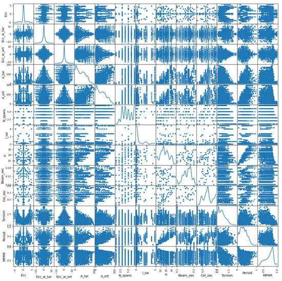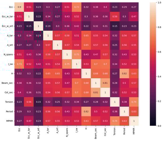 Figure 3 presents the MIC method’s correlation matrix, with the alpha and c parameters set to 0.7 and 15, respectively. The observed high correlation coefficient of 0.56 between torsional irregularity and Ecc_w_tar highlights the significant impact of the irregular distribution of infill walls on torsional behavior. The correlation coefficient of 0.82 between building height and the fundamental period and 0.63 between building height and MPMR reaffirms the well-known relationship between these parameters. These correlations have been documented in design codes [,,,,,] and recent studies [,,,,]. Additionally, correlations were observed between specific input parameters, such as the correlation coefficient of 0.65 between H and infill wall areas (A_tar and A_ort) and 0.68 between H and Col_sec. These correlations arise from the inherent relationship between these parameters, where a change in one parameter naturally affects the other. Given the intrinsic relationships between some parameters, the MIC correlation matrix for the input variables does not reveal significant correlations that might indicate multicollinearity. This observation suggests that multicollinearity is unlikely to be a substantial issue in this analysis. It is worth noting that the Ecc parameter possesses a distinct characteristic, as it heavily relies on other parameters. Altering the Ecc parameter causes a change in other parameters. This inherent relationship limits the MIC method’s ability to fully capture information solely from Ecc, leading to a ratio that does not reach 1. To address this, we ensured numerous unique Ecc values (see Table 1) to maximize information retrieval []. Therefore, achieving a 90% ratio is deemed satisfactory for this problem.