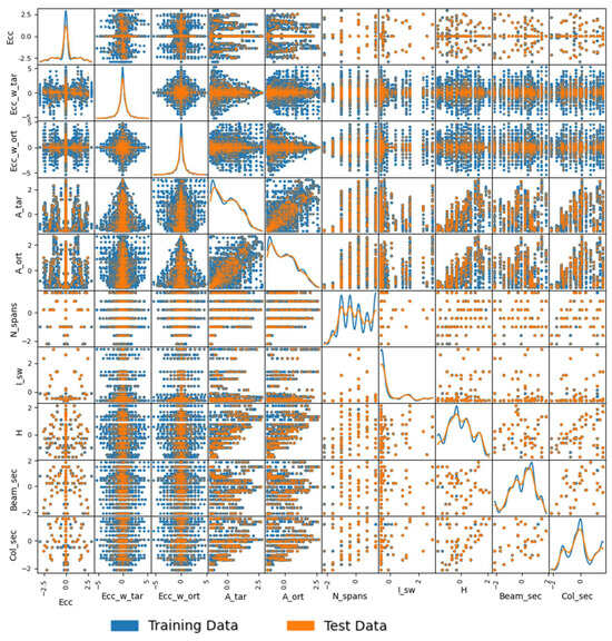 Subsequently, the data were randomly split into training and testing sets, each accounting for 85% and 15% of the overall dataset volume. The first is used to train the model and build an input–output relationship, while the latter is used to evaluate the model’s performance on new data. The distribution of the scaled training and test datasets is shown in Figure 4, where both training and test samples have almost the same distribution.